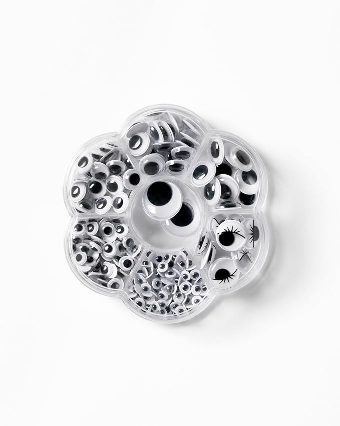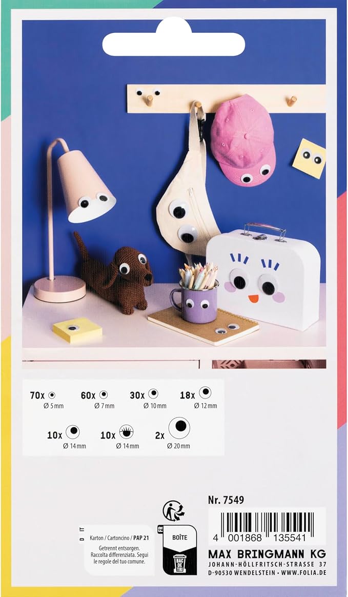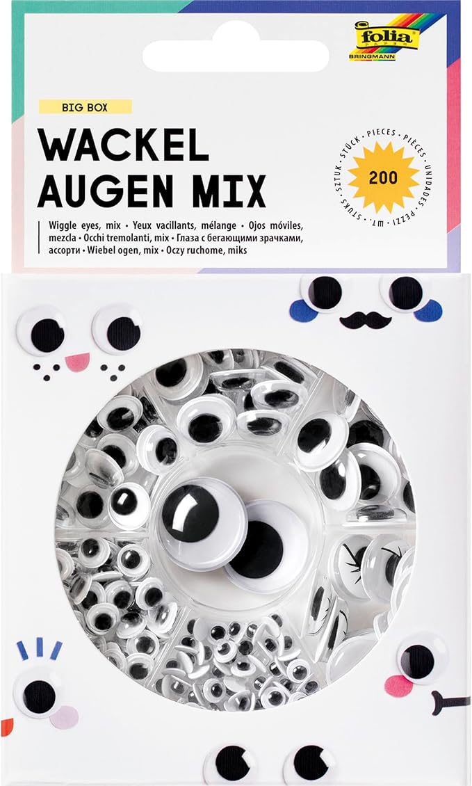 Los clásicos ojos móviles de Folia son ideales para dar vida a tus manualidades. La Caja Grande Mix contiene 200 ojos saltones clásicos en blanco con pupila negra, incluyendo dos tamaños con pestañas. Los ojos móviles vienen en los siguientes tamaños: diámetro 5, 7, 10, 12, 14 y 20 mm (diámetro 14 mm con y sin pestañas). Estos ojos móviles autoadhesivos lucen mucho más divertidos y vibrantes al crear figuras que pintados.