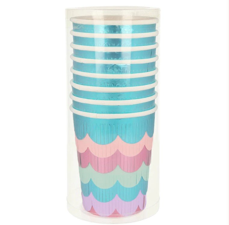 Estas hermosas tazas son perfectas para una fiesta de sirenas o bajo el mar. Están diseñados para parecerse a la cola brillante de una sirena, con 6 tiras de flecos de papel de aluminio festoneado en capas para crear un efecto sensacional.