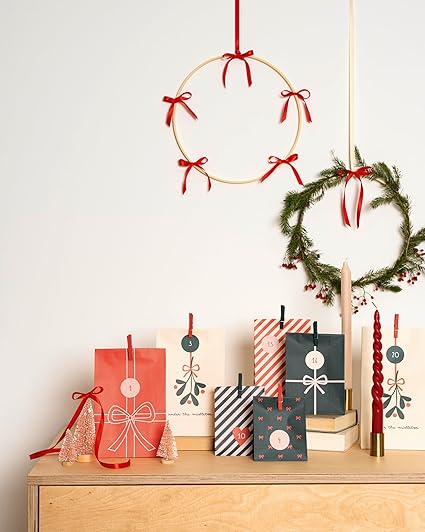 Crea un calendario de Adviento personalizado para toda la familia con el set de bricolaje BOWTIFUL CHRISTMAS de folia. El set de bricolaje consta de 24 bolsas de papel con 6 diseños navideños, 24 pegatinas numeradas y 24 pinzas de madera en rojo y verde.