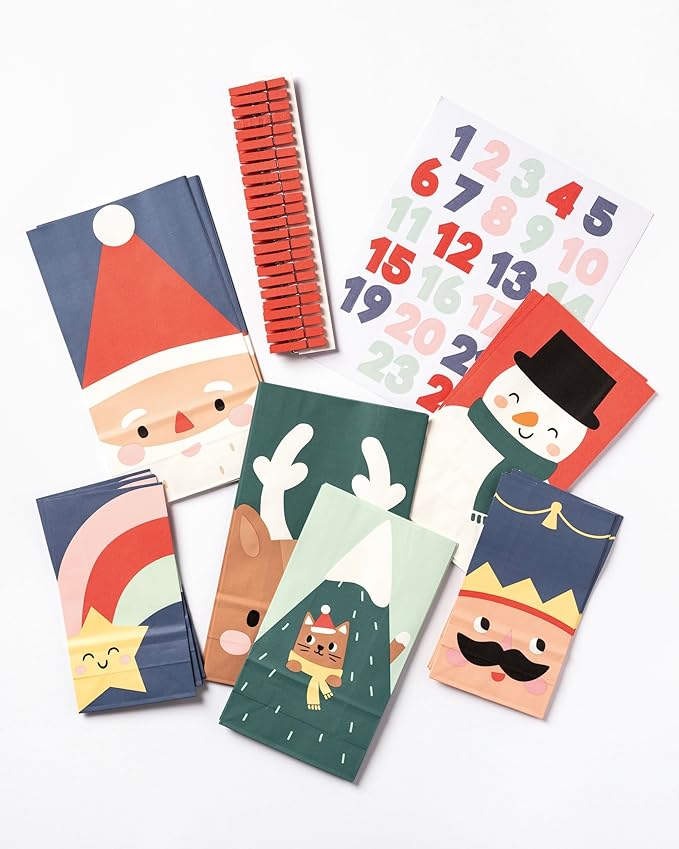 Con el set de calendario de adviento DIY "Santa y sus amigos" de folia, crea un calendario de adviento personalizado para toda la familia. El kit consta de 24 bolsas de papel con 6 motivos navideños, 24 pegatinas numeradas y 24 pinzas de madera rojas y verdes.