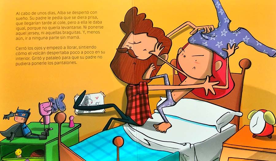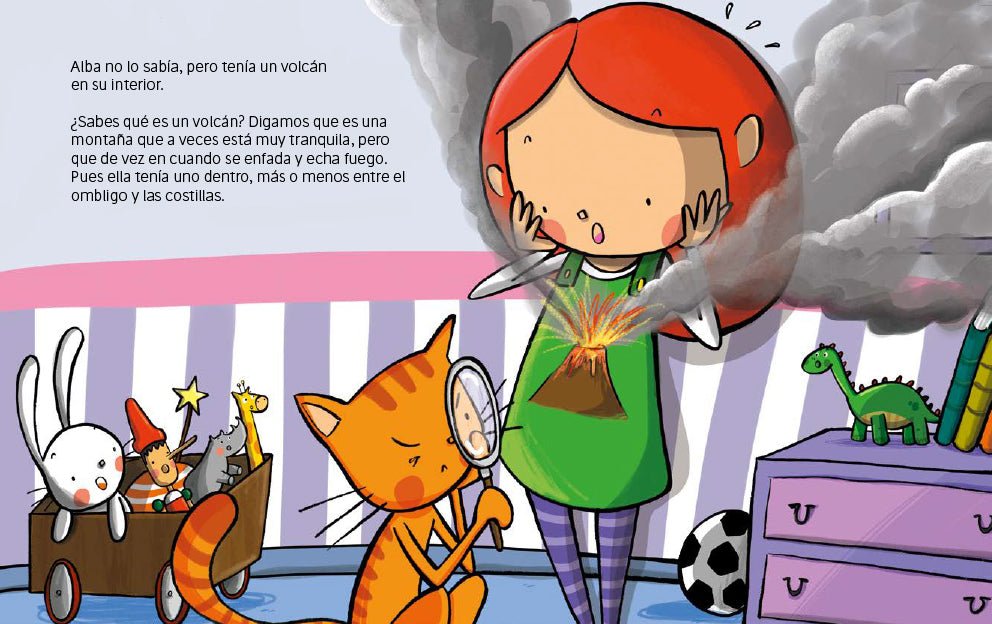 Alba no lo sabía, pero tiene un volcán en su interior, más o menos entre el ombligo y las costillas. A veces, el volcán se enciende y explota. Entonces el fuego lo quema todo y Alba sufre y se asusta, todo a la vez. Pero una noche una pequeña hada le explica qué puede hacer cuando se enfada, un truco que la llevará a descubrir sensaciones inesperadas.