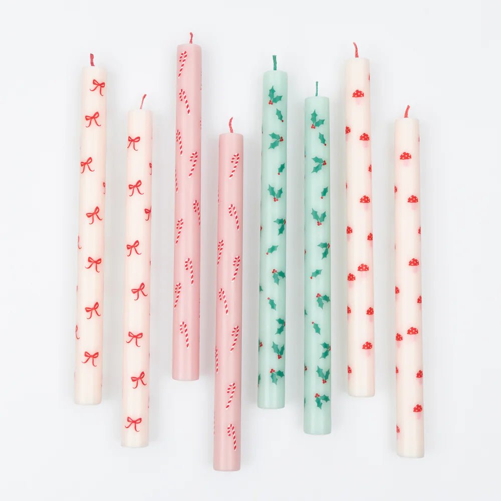 Llegó la época de las velas navideñas! Realza tu decoración navideña con este elegante juego de ocho velas festivas de mesa, con una combinación de estampados y colores atemporales y contemporáneos. Las llamativas mechas rojas y verdes añaden un toque especial, creando una luz cálida y acogedora. Perfectas para tu mesa o repisa como centro de mesa, o para decorar tu hogar. Bellamente empaquetadas en una caja de recuerdo con estampado, también son un elegante regalo para anfitriones o un detalle especial para alguien que adora las velas llamativas.