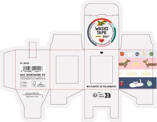La cinta washi es una cinta fácil de rasgar a mano y ligeramente transparente, hecha de papel de arroz con una superficie mate. El término washi proviene del japonés y significa arroz. Con la cinta washi, la creatividad y la decoración no tienen límites. Gracias a su textura, se puede escribir sobre ella con diferentes rotuladores. Se adhiere a diversas superficies, como papel, pared, tela, metal, vidrio, etc., y se puede despegar y reutilizar sin dejar residuos. Recibirás un juego de 4 rollos con diferentes diseños, cada uno de 2 m de largo. Dos rollos tienen un ancho aproximado de 10 mm y los otros dos de 15 mm.