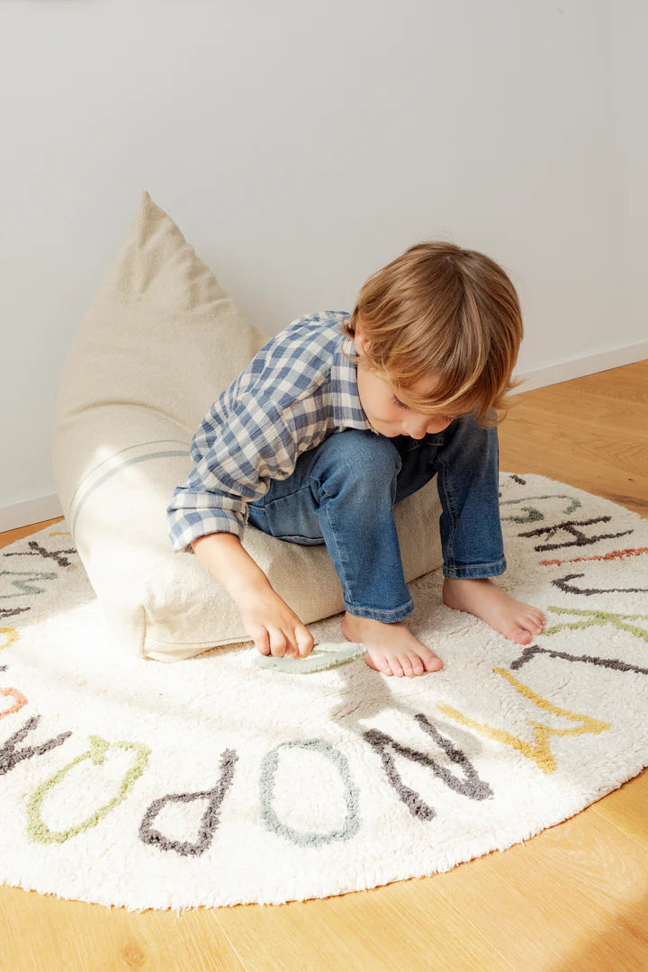 ¡Aprender el abecedario nunca fue tan divertido! Esta alfombra de 120 cm, inspirada en nuestro icónico diseño ABC, presenta letras en tonos vivos sobre una base suave en color natural y marfil. Incluye mini cojines de lona con las vocales para interactuar mientras juegan. ¡Educación y juego van de la mano!