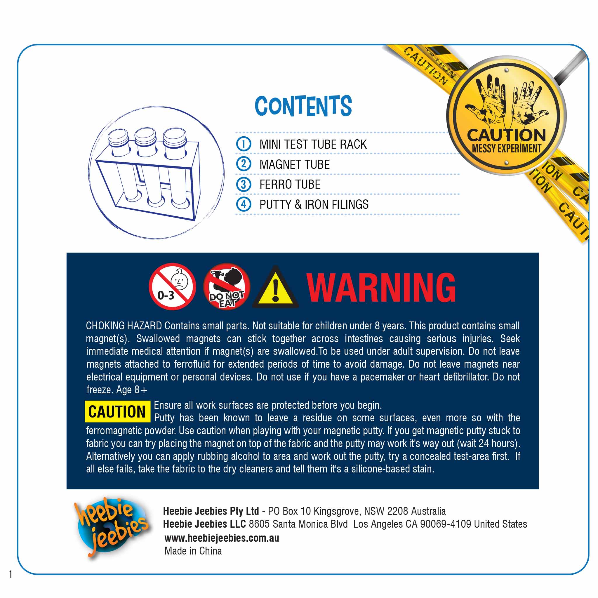 3 tubos que contienen polvo Ferro, masilla, limaduras de hierro y un imán superpotente para realizar un montón de experimentos magnéticos realmente únicos.