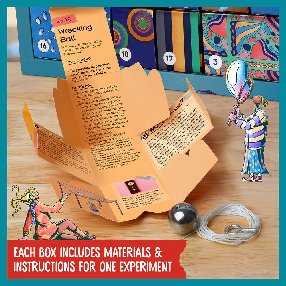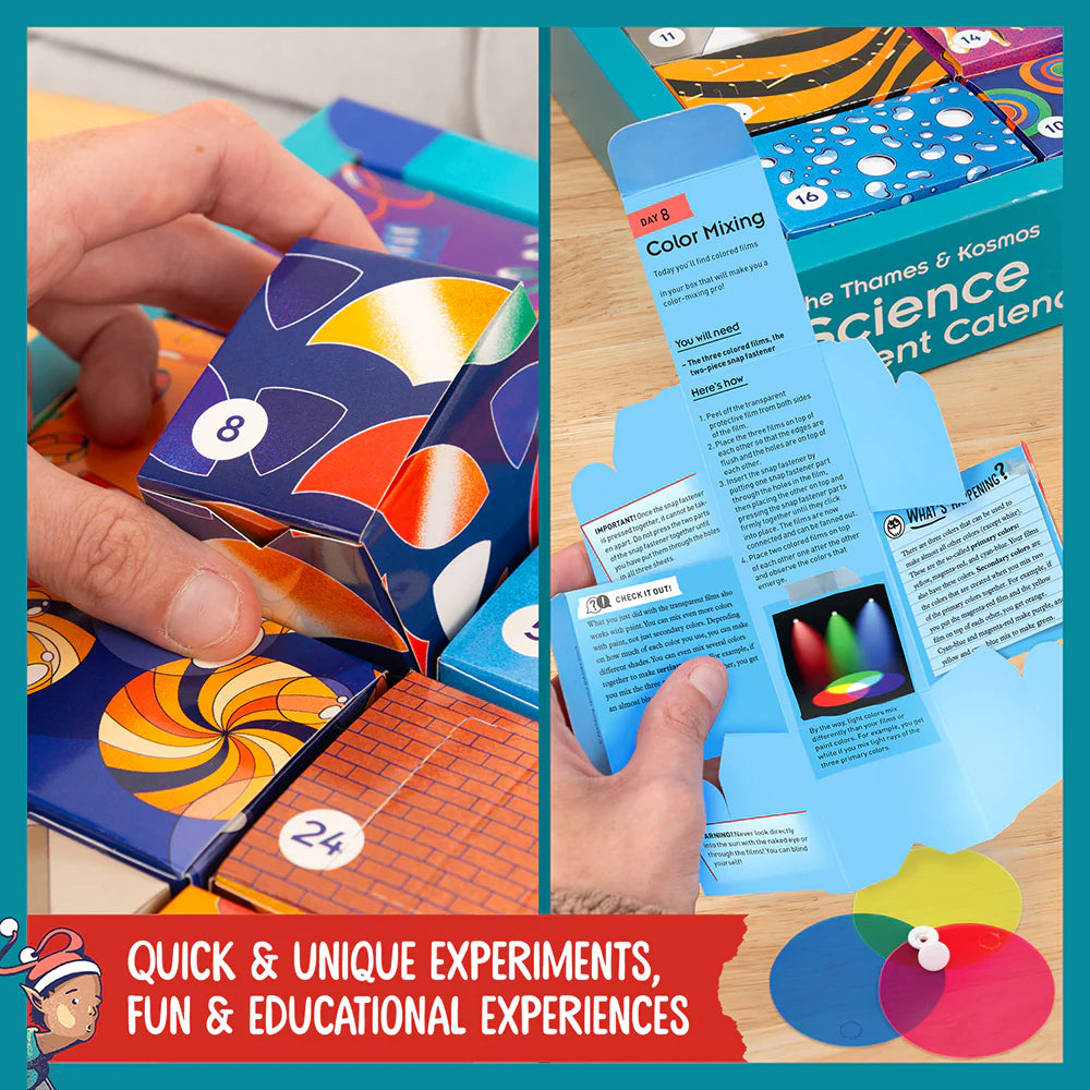 ¡Es la temporada de la ciencia! La Navidad es tiempo de experimentación. Descubre algo nuevo y asombroso cada día hasta las fiestas. Con este calendario de adviento, los niños abren una caja nueva cada día para encontrar nuevos equipos o materiales e instrucciones para un experimento científico. Los experimentos se pueden realizar rápidamente y solo requieren artículos adicionales que se encuentran comúnmente en cualquier hogar. Cada una de las 24 cajas bellamente diseñadas incluye materiales de experimento únicos e instrucciones escritas e ilustradas por expertos.