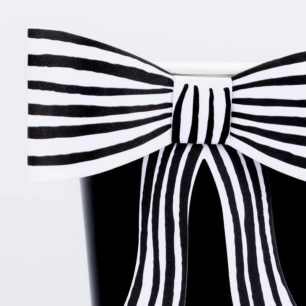 Sorprende a los pequeños magos y brujas con una elegante y misteriosa fiesta de Halloween. Estos vasos negros, adornados con elegantes lazos de rayas, le dan un toque mágico a tus bebidas. El clásico diseño en blanco y negro combina a la perfección con el resto de tu vajilla y decoración de Halloween.