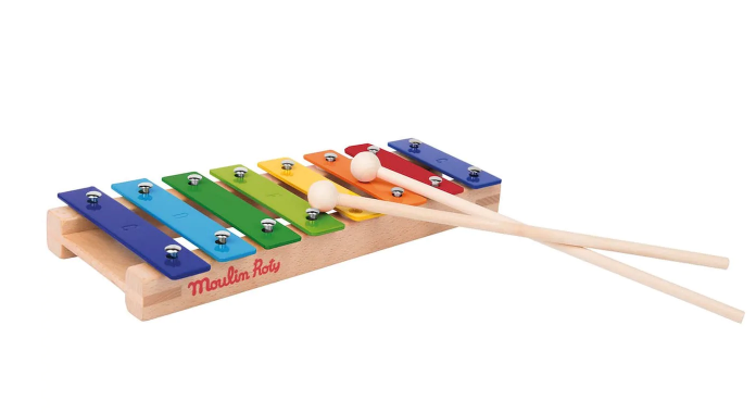 Aquí hay un xilófono de madera colorido  para aprender las primeras notas musicales.