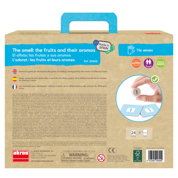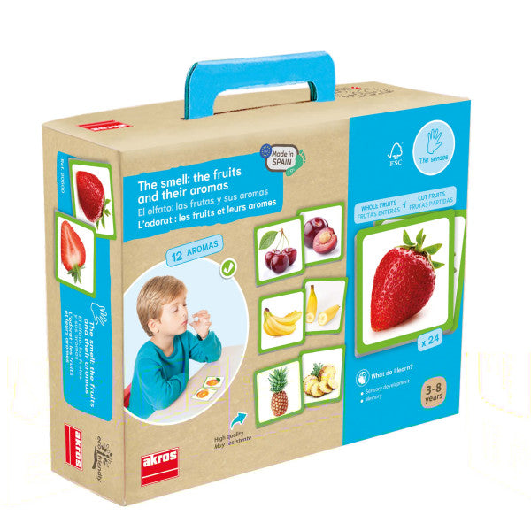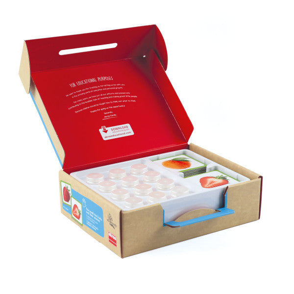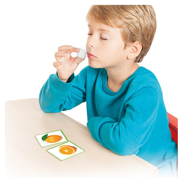Juego sensorial para desarrollar el sentido del olfato mediante la distinción del aroma de diferentes frutas.