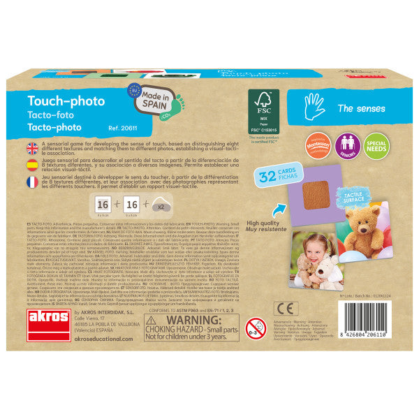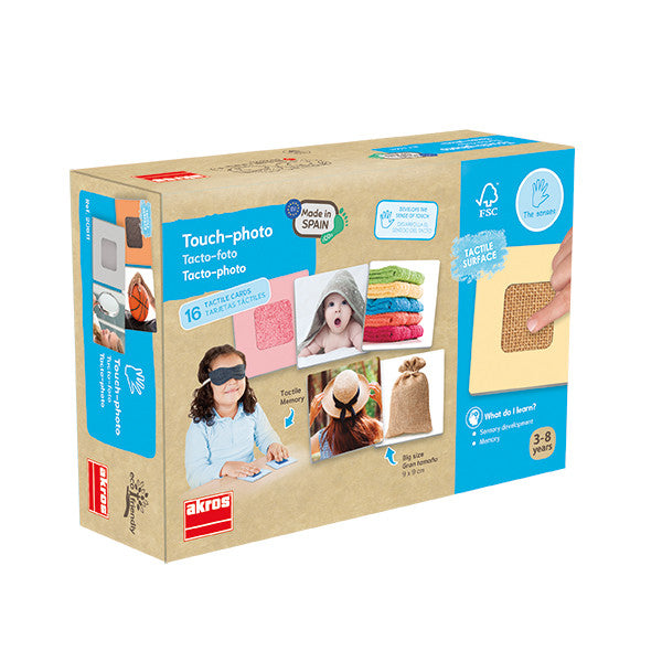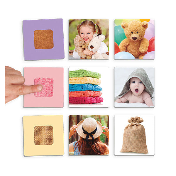 Un juego sensorial para desarrollar el sentido del tacto, basado en distinguir ocho texturas diferentes y relacionarlas con distintas fotografías, estableciendo una asociación visual-táctil.