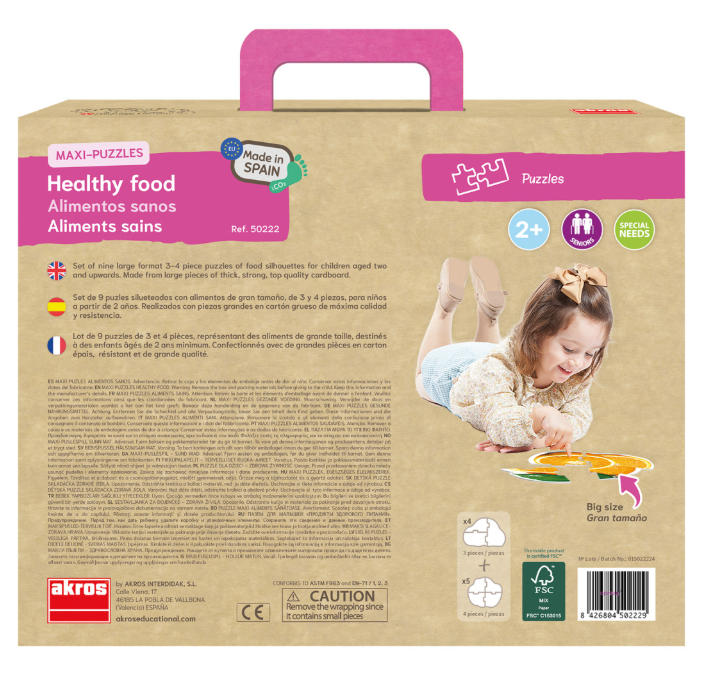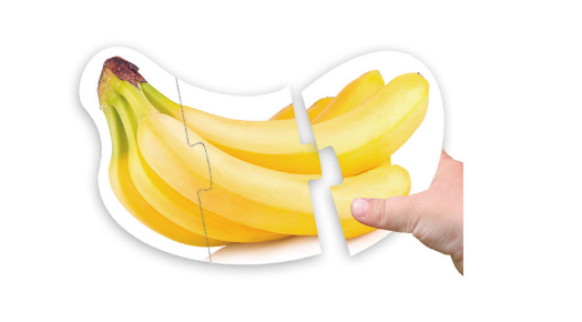 Conjunto de nueve puzles de gran formato de 3 o 4 piezas con siluetas de alimentos para niños a partir de dos años.