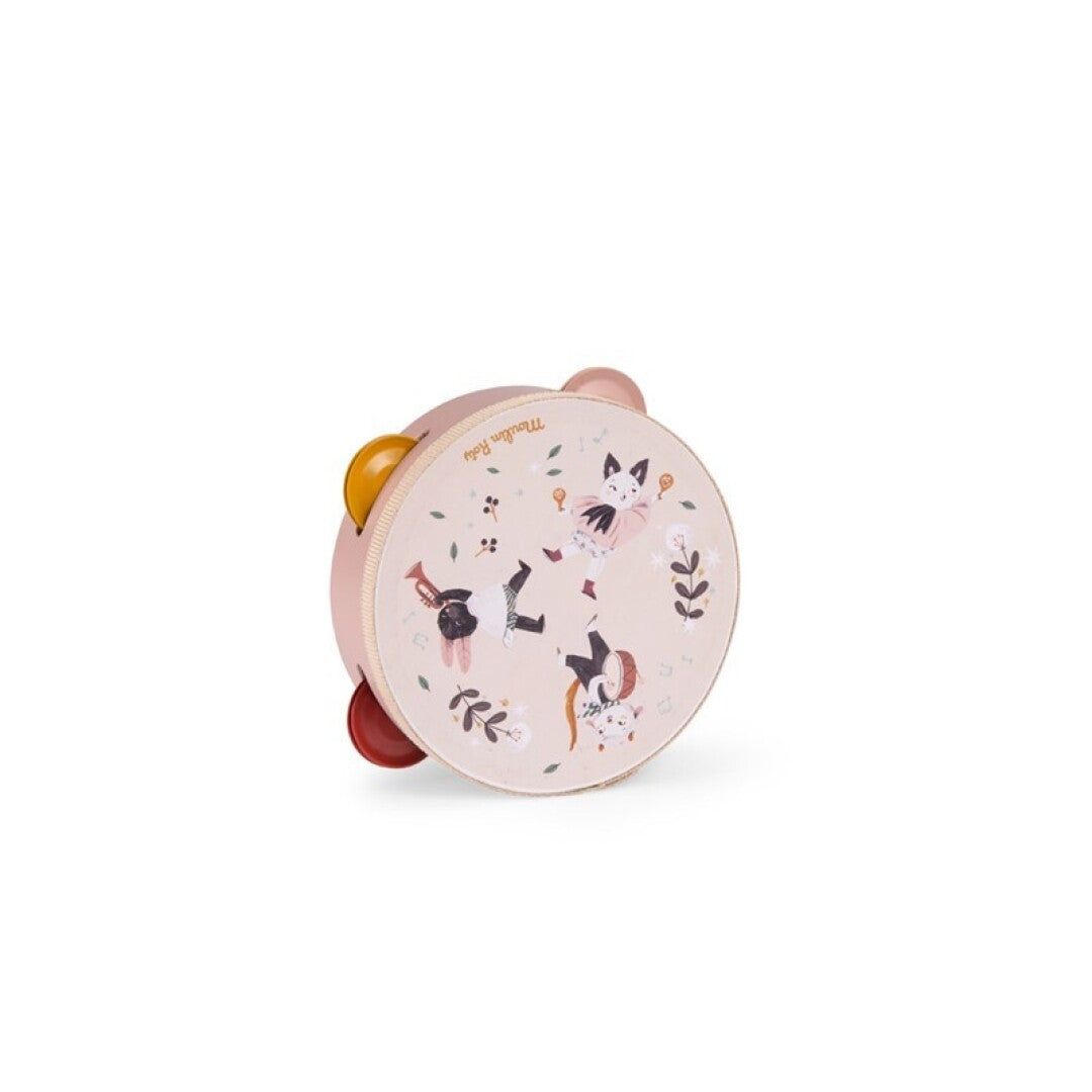 Pandereta con 4 platillos de madera pintada, decorada con ilustraciones poéticas de la colección Après la pluie. Desarrolla el ritmo y la sensibilidad musical en niños pequeños, fácil de usar.
