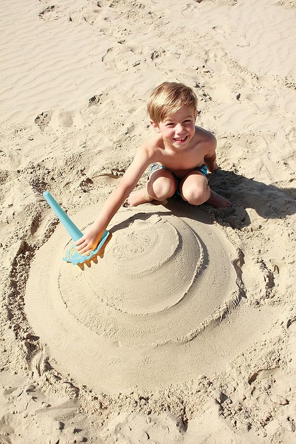 Pala, rastrillo, tamiz y mucho más Triplet es un juguete multifuncional único que hace que crear estructuras de arena sea divertido y fácil. Parte pala, para ayudar a los niños a cavar agujeros, construir cimientos y excavar fosos; parte tamiz de arena, para ayudar a eliminar conchas y otros sedimentos, para tener arena suave y moldeable; parte rastrillo, para que los niños puedan crear diseños adicionales. ¡El mango hueco incluso se puede usar como embudo de agua para rematar los castillos de arena más geniales con arte de arena!