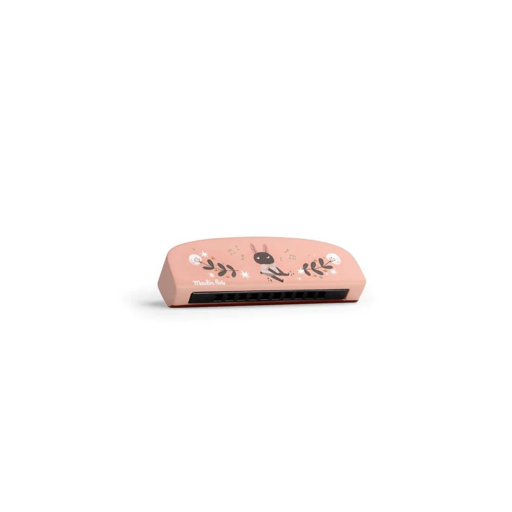 ¡Para los niños amantes de la música! Armónica de madera pintada decorada con ilustraciones poéticas que representan la colección Después de la Pluie de Moulin Roty.