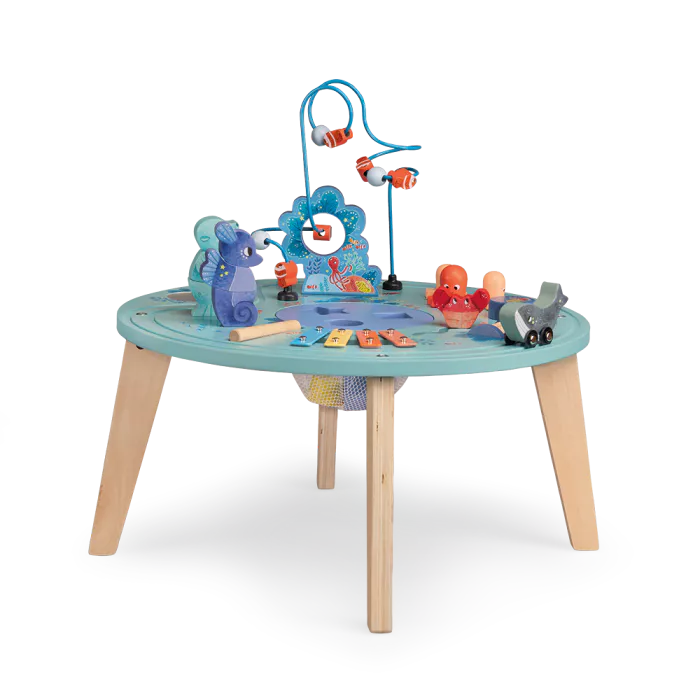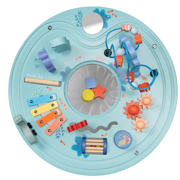 Girando con el pez payaso, dando vueltas con la ballena, zigzagueando con el cangrejo, muchas sorpresas esperan al bebé en esta bonita mesa de actividades colorida... incluso hay pequeños pulpos para girar, un león marino y un caballito de mar.