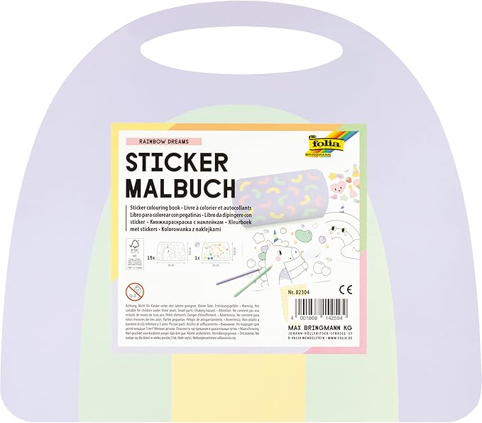 El libro para colorear de pegatinas Rainbow Dreams de folia contiene adorables motivos para dar rienda suelta a la imaginación. Sus 15 páginas preimpresas se pueden pintar y bordar a tu gusto. Además, el libro incluye una hoja con 36 pegatinas laminadas para decorar las ilustraciones. El libro, con diseño de animales, mide aprox. 26 x 16,8 cm y cuenta con una práctica asa para llevarlo contigo.