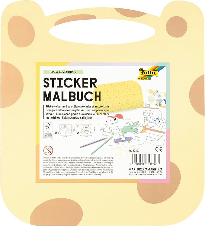 El libro para colorear de pegatinas "Aventuras Épicas" de folia contiene adorables motivos para dar rienda suelta a la imaginación. Sus 15 páginas preimpresas se pueden pintar y bordar a tu gusto. Además, el libro incluye una hoja con 36 pegatinas laminadas para decorar las ilustraciones. El libro, con diseño de animales, mide aprox. 21 x 16,8 cm y cuenta con una práctica asa para llevarlo contigo.