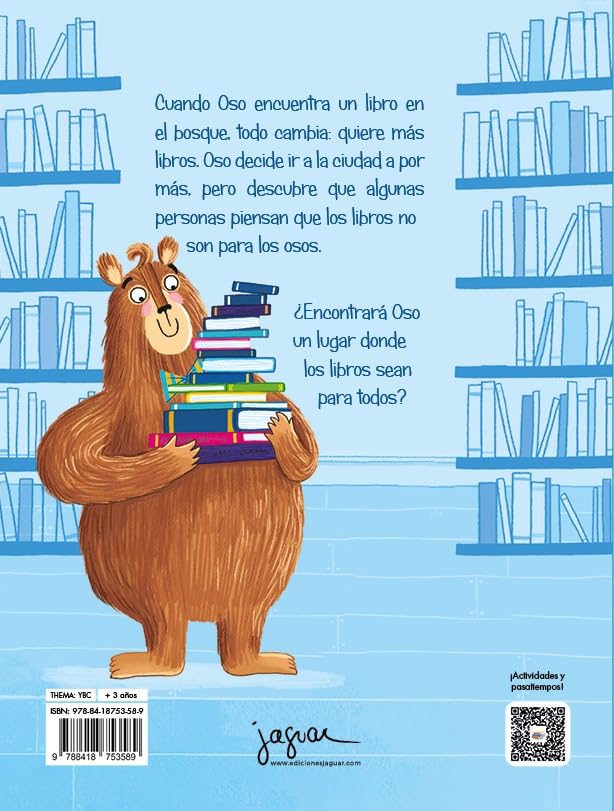 «El placer de la lectura es para todos.» Oso encuentra un libro en mitad del bosque. Corriendo, va a ver a su aimigo Búho para que le enseñe a leer. A partir de ahí... Oso se da cuenta de que quiere más y más libros. Sin pensárselo mucho, coge una bici que encuentra y se dirige a la ciudad a por más, pero la gente de la ciudad lo único que le dice es que los libros no son para los osos.