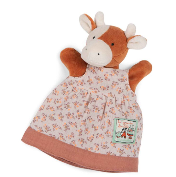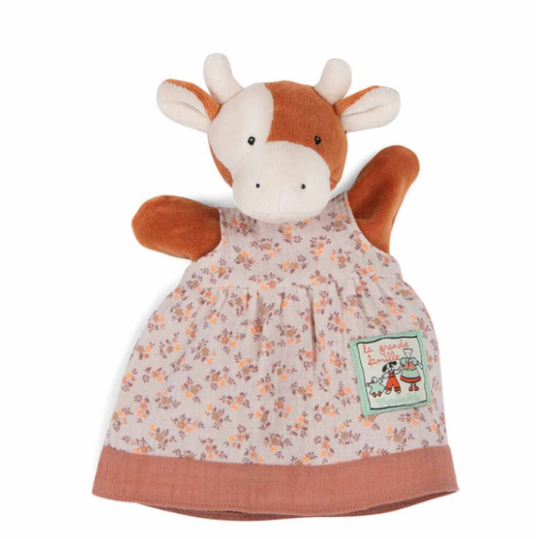 Marioneta de vaca Charlotte de Moulin Roty. Parte de la colección La Grande Famille. Esta vaca marioneta de mano de tela es tan linda, lleva un vestido floral y tiene una textura suave y esponjosa. Es fácil manipularla y jugar con ella, lo que da vida a historias imaginativas.
