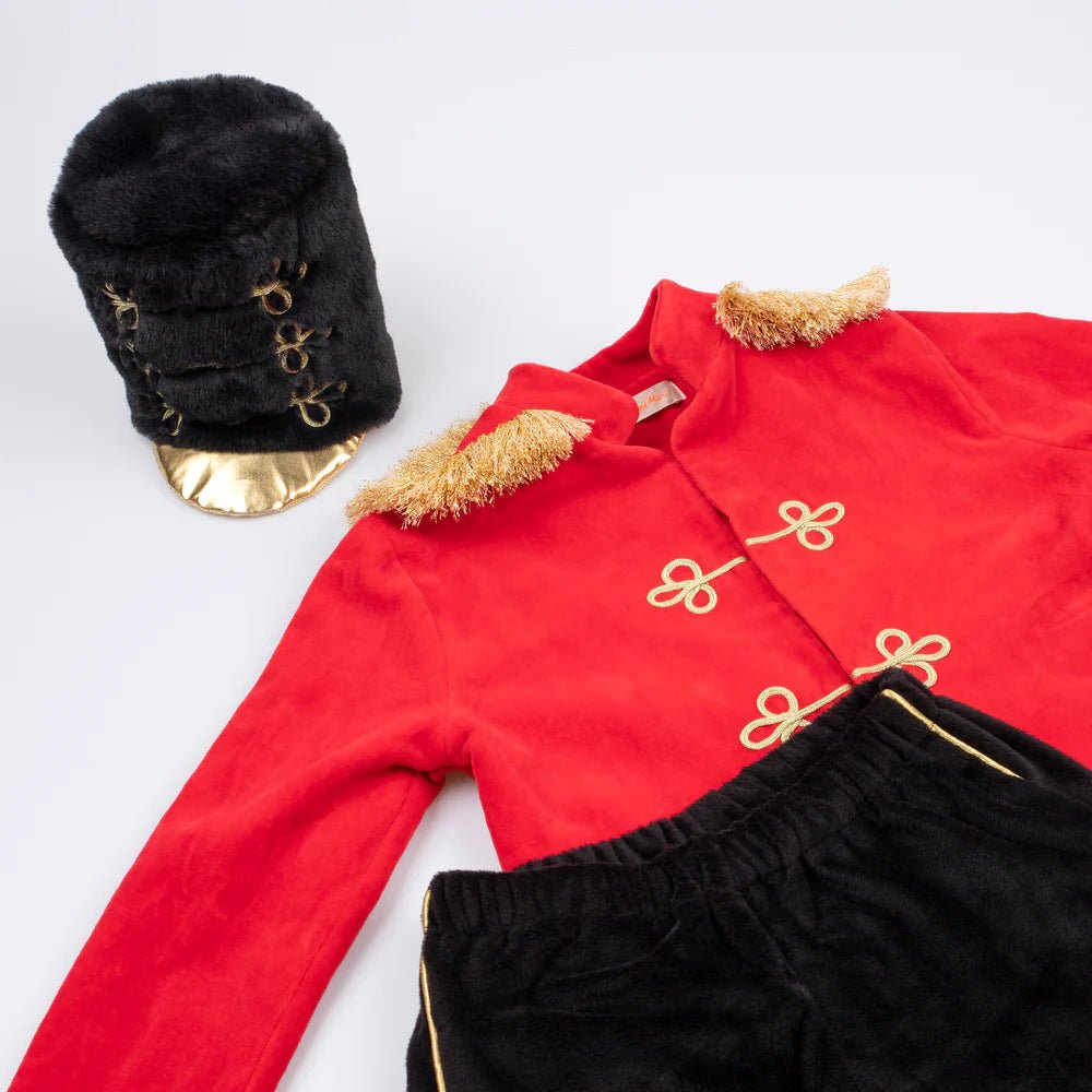 - La chaqueta está hecha de lujoso terciopelo rojo con un forro de polialgodón rojo, detalles de cordón dorado, charreteras con flecos dorados y un cierre a presión en tono dorado.