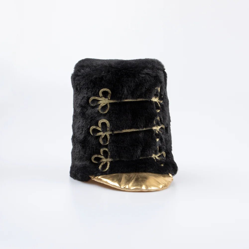 - El sombrero está hecho de suave felpa negra con una visera de cuero sintético dorado, elástico de terciopelo dorado con cierre de velcro y un forro de polialgodón negro.