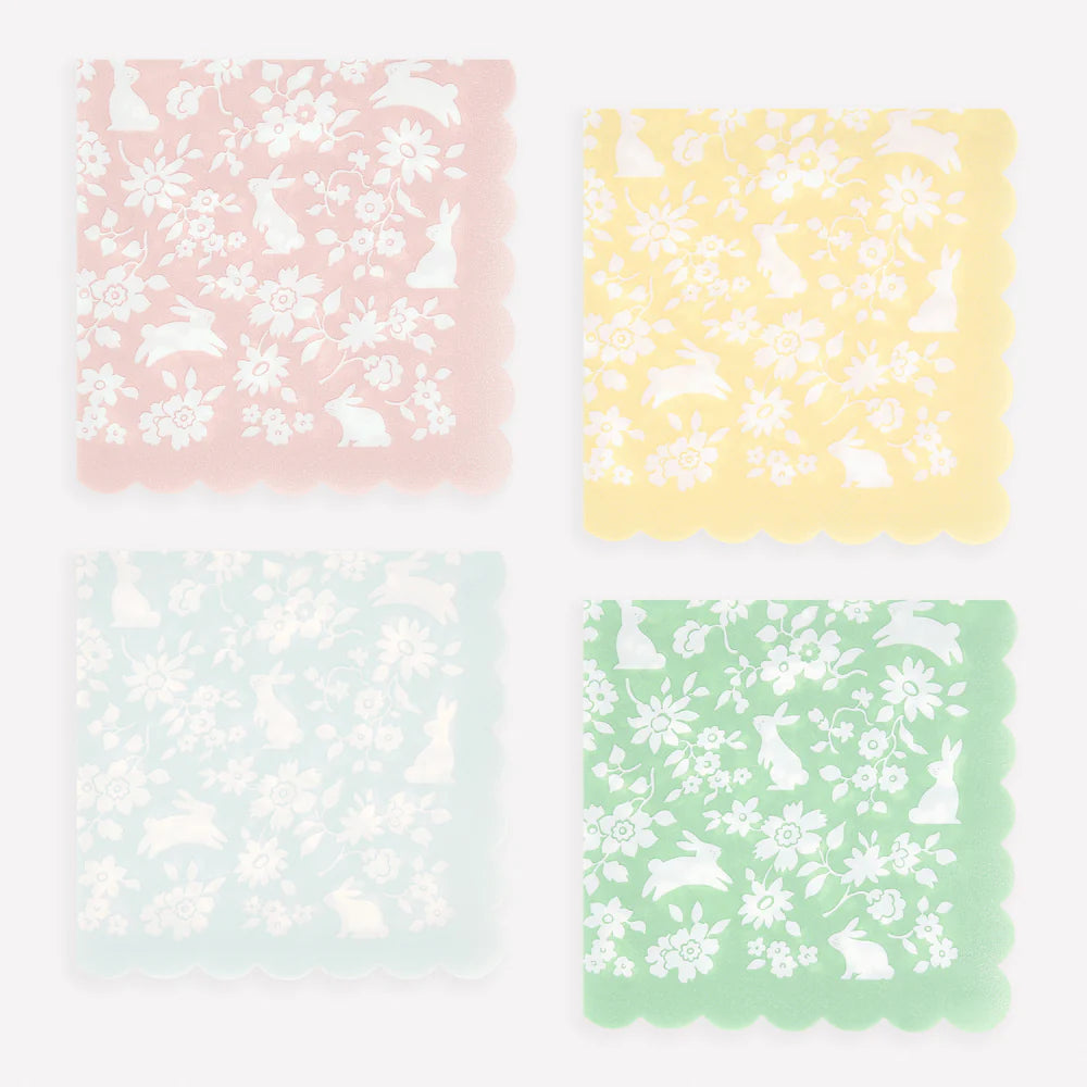Prepara la mesa para la alegría primaveral. Estas servilletas de papel son una forma fresca y encantadora de realzar tu mesa de temporada. Con un estampado floral, adorables ilustraciones de conejitos y un borde ligeramente festoneado, tienen un carácter alegre y un acabado refinado. Cada juego viene en cuatro hermosos tonos primaverales, perfectos para combinar con el resto de tu vajilla de Pascua. Ideales tanto para niños como para adultos.