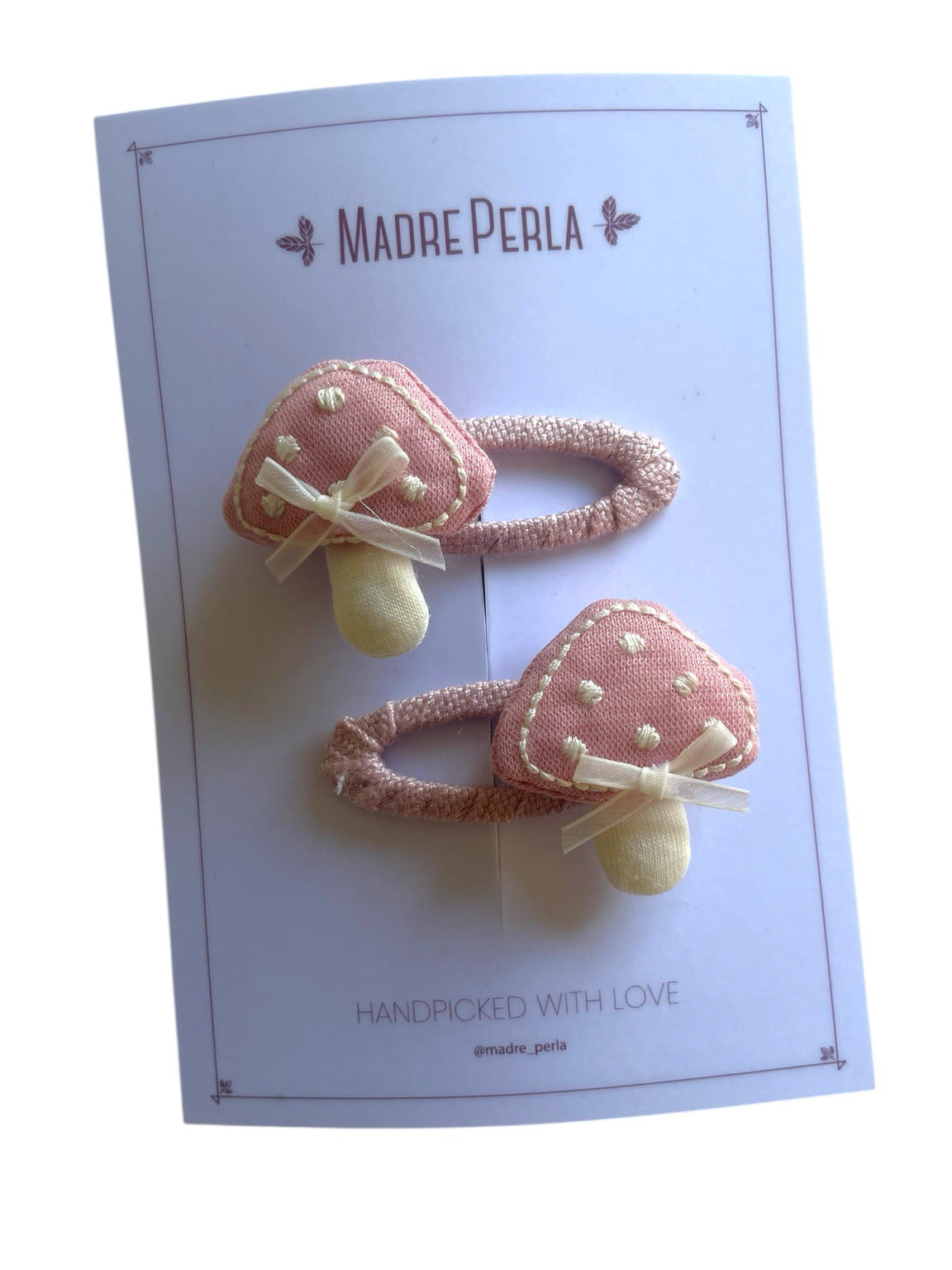 Honguitos delicados, bordados a mano con suavidad y encanto. Un pequeño detalle mágico que ilumina cualquier peinado.