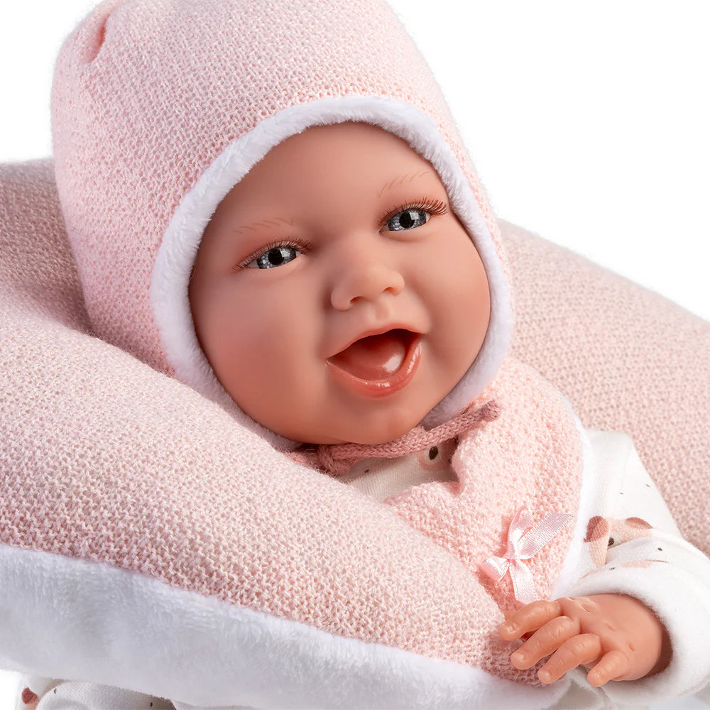 Mimi ríe si le aprietas la barriga y dice mamá y papá. Es una bebé muy simpática, su pijama está estampado con ositos a juego con el cojín con forma de luna que permite acostarla de múltiples maneras.