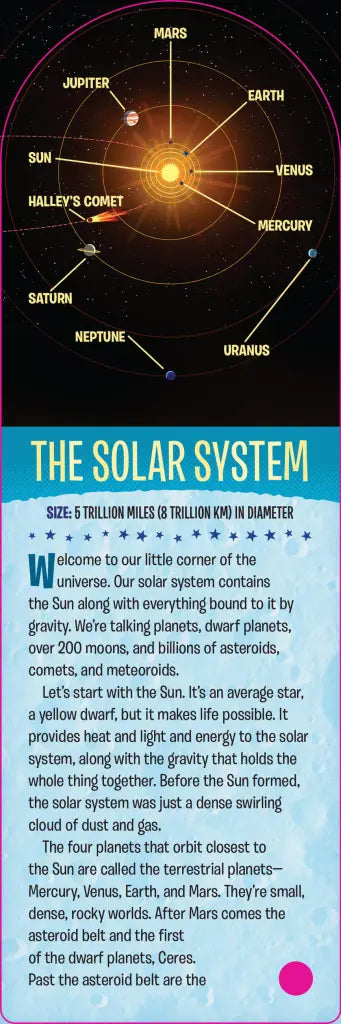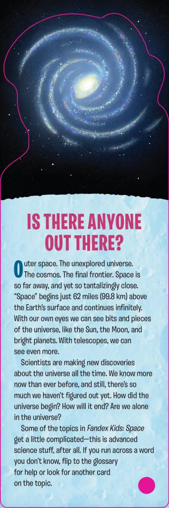 Lánzate a lo desconocido con una emocionante aventura que incluye 52 tarjetas troqueladas a todo color con brillantes ilustraciones de planetas, galaxias, estrellas, misiones espaciales y mucho más.