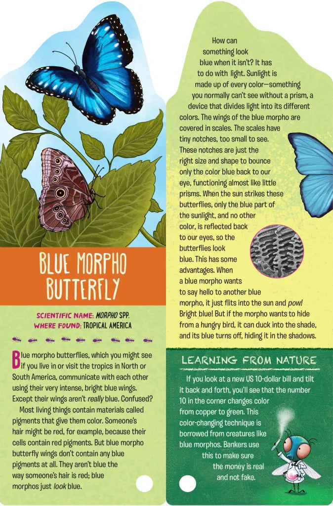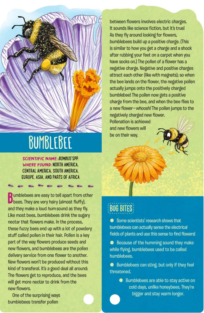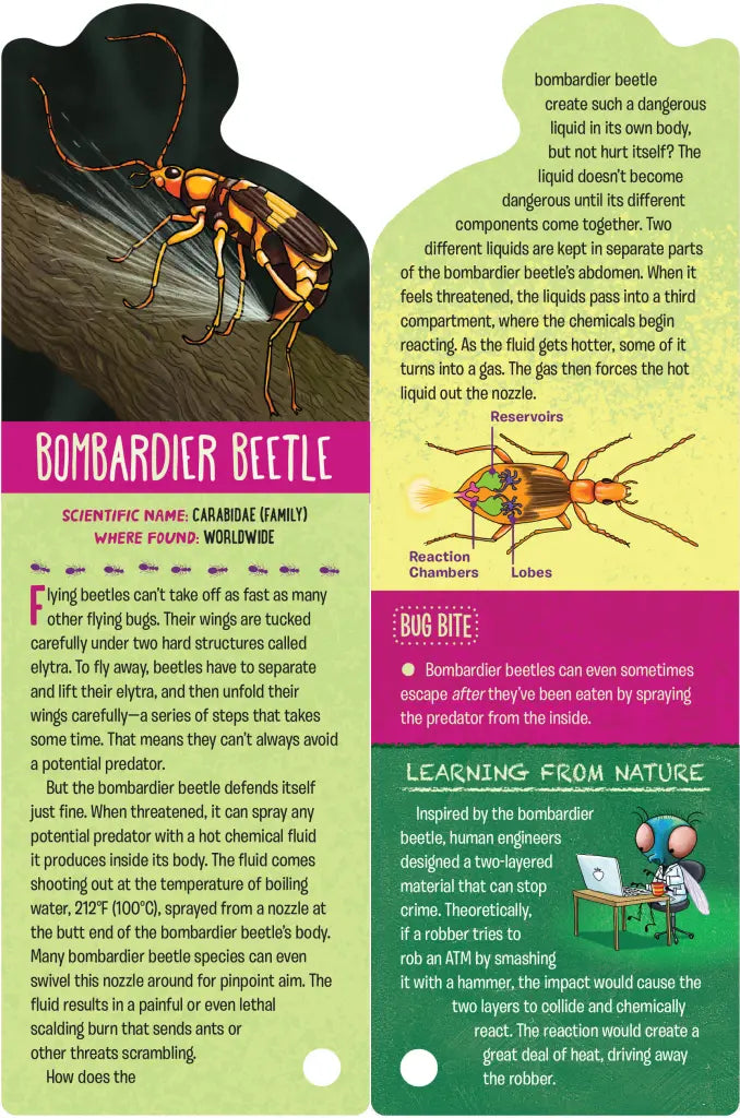 Aprende sobre el escarabajo bombardero y su diabólico mecanismo de defensa: si lo atacan, rocía a su enemigo con un fluido químico hirviendo. O sobre la abeja, con su impresionante capacidad para polinizar muchos de nuestros cultivos mientras produce esa deliciosa delicia: la miel. Cada carta está ilustrada con gran detalle y gran realismo, e incluye información sobre los hábitos y el hábitat de la criatura. ¡Y una sección especial "Aprendiendo de la naturaleza" describe cómo los insectos inspiran inventos en medicina, ingeniería e incluso programación!