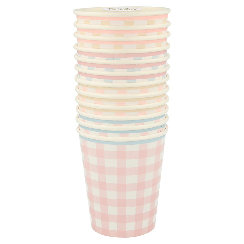 Estas tazas vienen en 3 x 4 colores de estampado de cuadros vichy: azul, coral, rosa y amarillo.