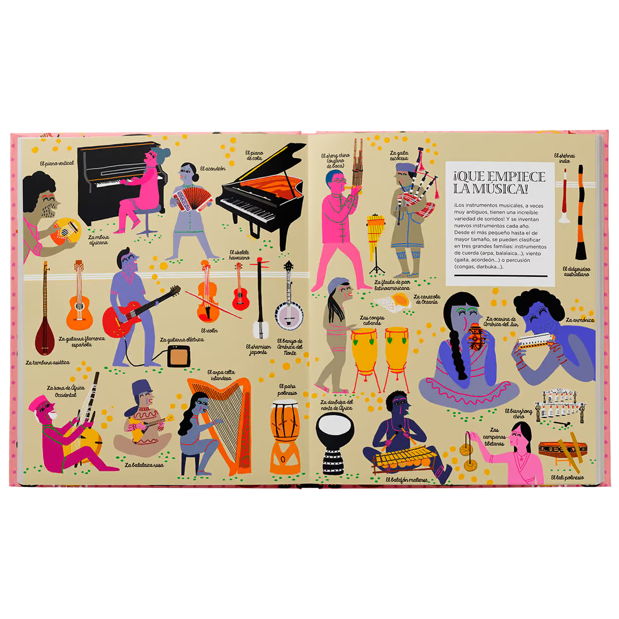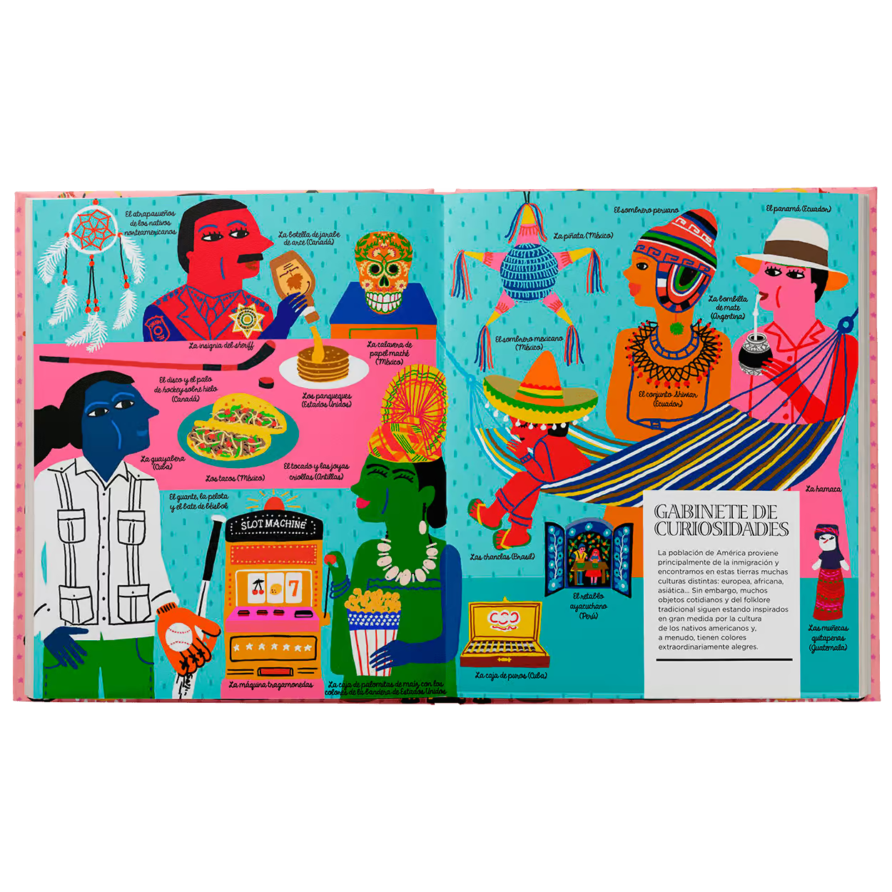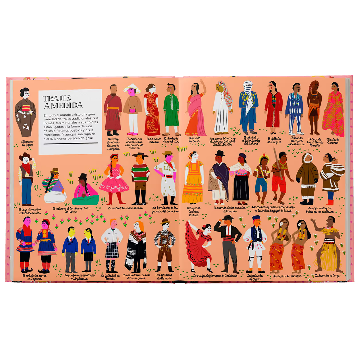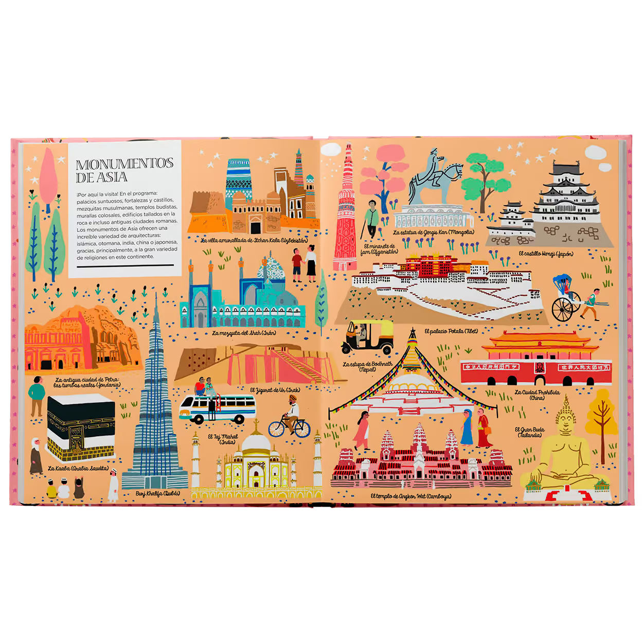 Un libro ilustrado con detalle en el que no faltan los vestidos e instrumentos tradicionales, las banderas y monedas nacionales, los transportes típicos y un recorrido por la fauna y la flora, los monumentos y los objetos cotidianos de cada continente. Todos estos magníficos dibujos permiten la comparación rápida entre las construcciones, las costumbres, la vida natural y las curiosidades de cada rincón del globo.